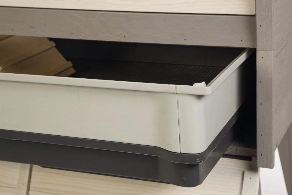 Het dak van de kooi is voorzien van een rubberen coating en steekt aan de voor- en achterkant iets uit. Hierdoor kan het water mooi aflopen. De poten van de kooi worden beschermd door doppen, zodat de kooi niet direct in contact staat met de grond.