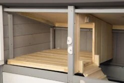 De hoog opstaande bak aan de binnenkant zorgt ervoor dat alles mooi in de kooi blijft en is eenvoudig schoon te maken. Er zijn twee trapjes te vinden in de kooi, waarvan ook een trap die tot onder de kooi gaat. Dit zorgt ervoor dat je de kooi ook uit zou kunnen breiden met een ren, om jouw konijn nog meer vrijheid te geven.