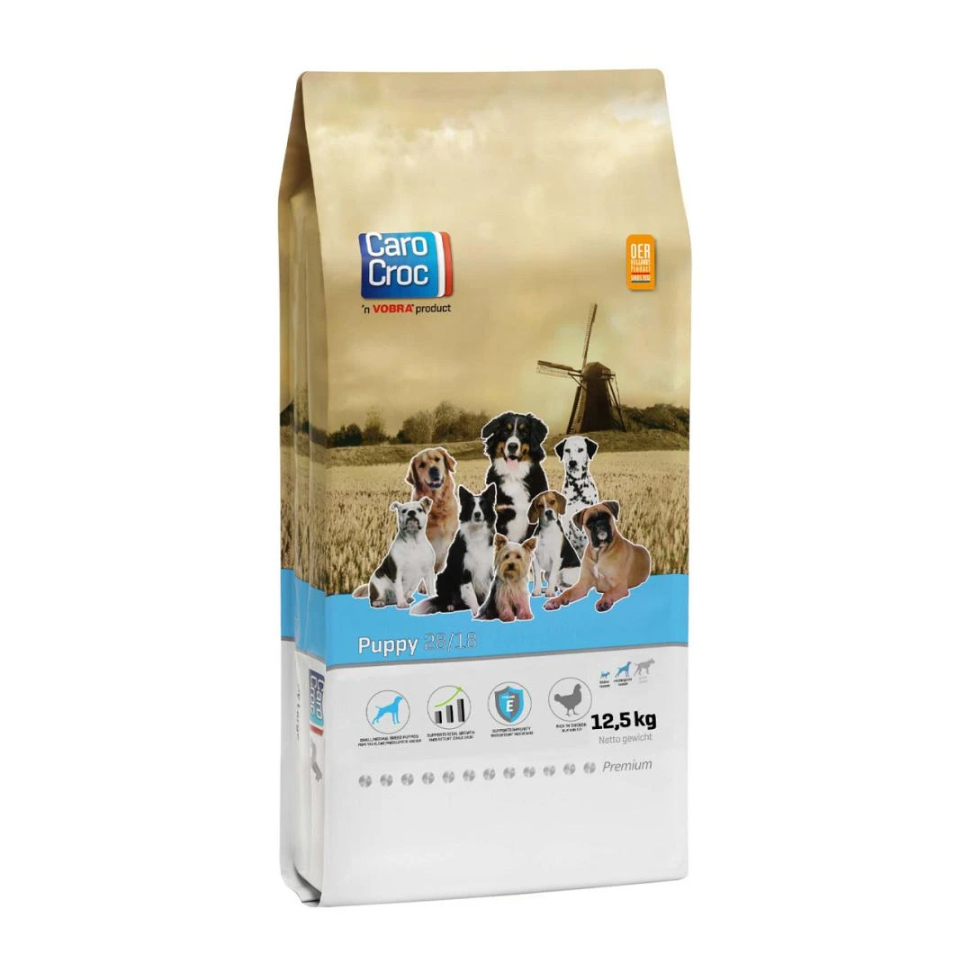 CaroCroc Puppy 28/18 is een complete voeding voor pups en jonge opgroeiende honden van kleine/middelgrote rassen.