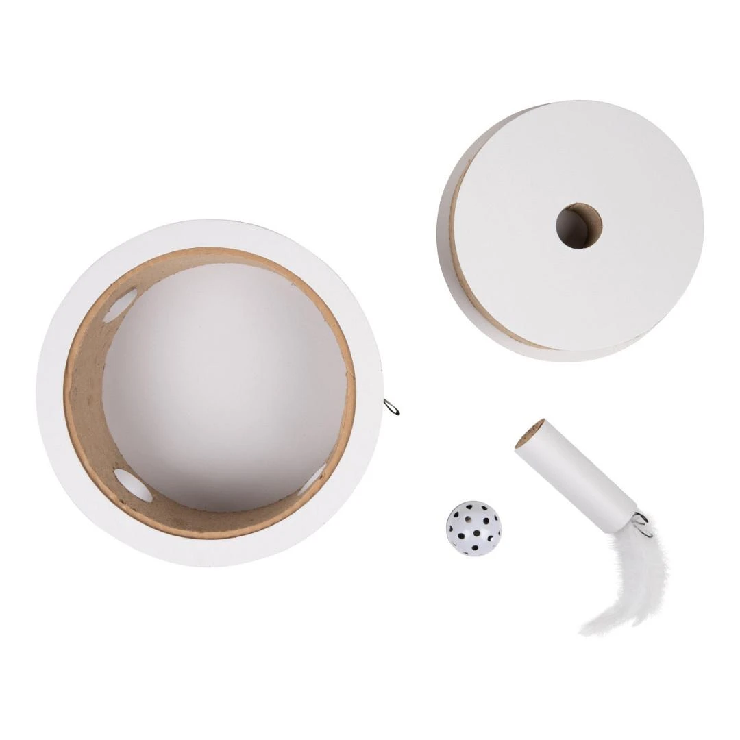 De District 70 Fiesta is stijlvol kartonnen krabspeelgoed dat geluid maakt. Het is gemaakt van duurzaam golfkarton, kan eenvoudig in elkaar worden gezet en bestaat uit drie lagen. De onderste laag is hol en hierin rolt een balletje welke gevuld is met rinkelende belletjes. Hier zal jouw kat urenlang speelplezier aan beleven.