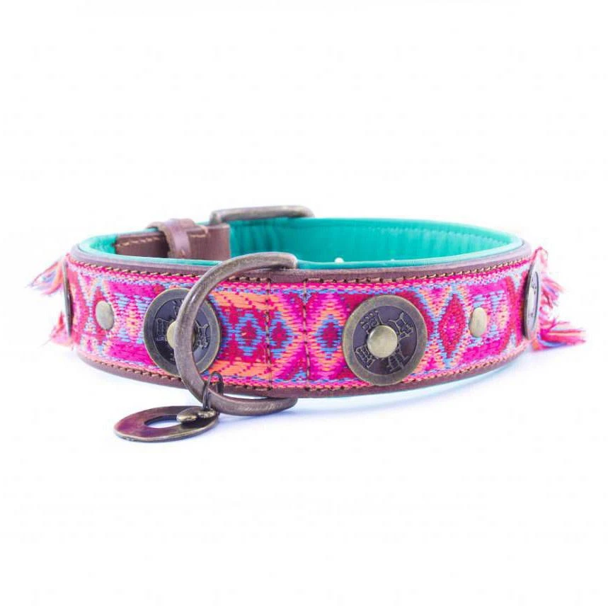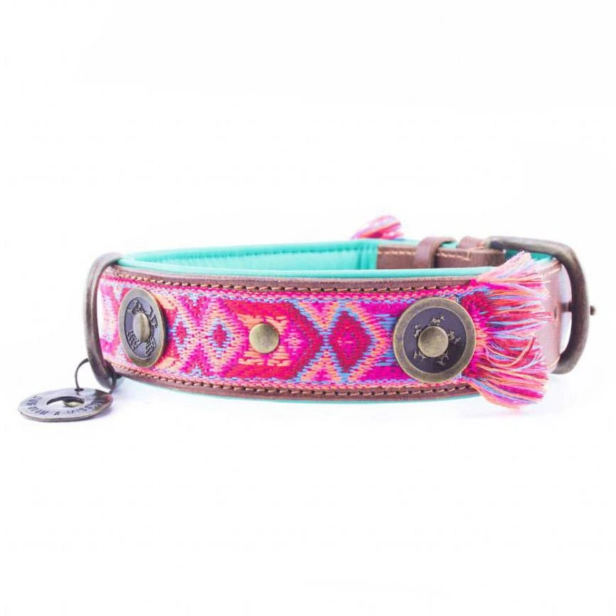 Dog with a Mission Halsband Boho Rosa is handgemaakt, geborduurd en gestikt. De combinatie van bruin leer met roze gestikte versiering maakt deze band voor elke hond geschikt!