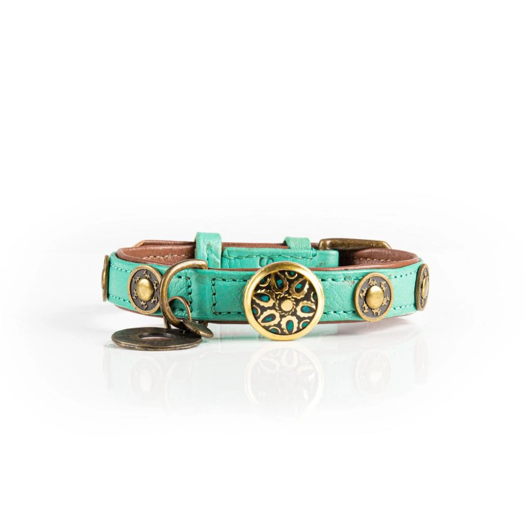 De Dog with a Mission Halsband Rebel is een prachtige turquoise/bruin leren halsband met gouden details. Creëer een unieke en stoere look met de toffe Rebel!