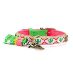 Deze groene en vrolijke Dog with a Mission halsband Tropical Summer met roze binnenkant is voorzien van kraaltjes in een cactus patroon. Haal een beetje vakantie in huis, gewoon omdat het kan. Deze gezellige halsband maakt elke dag mooier.