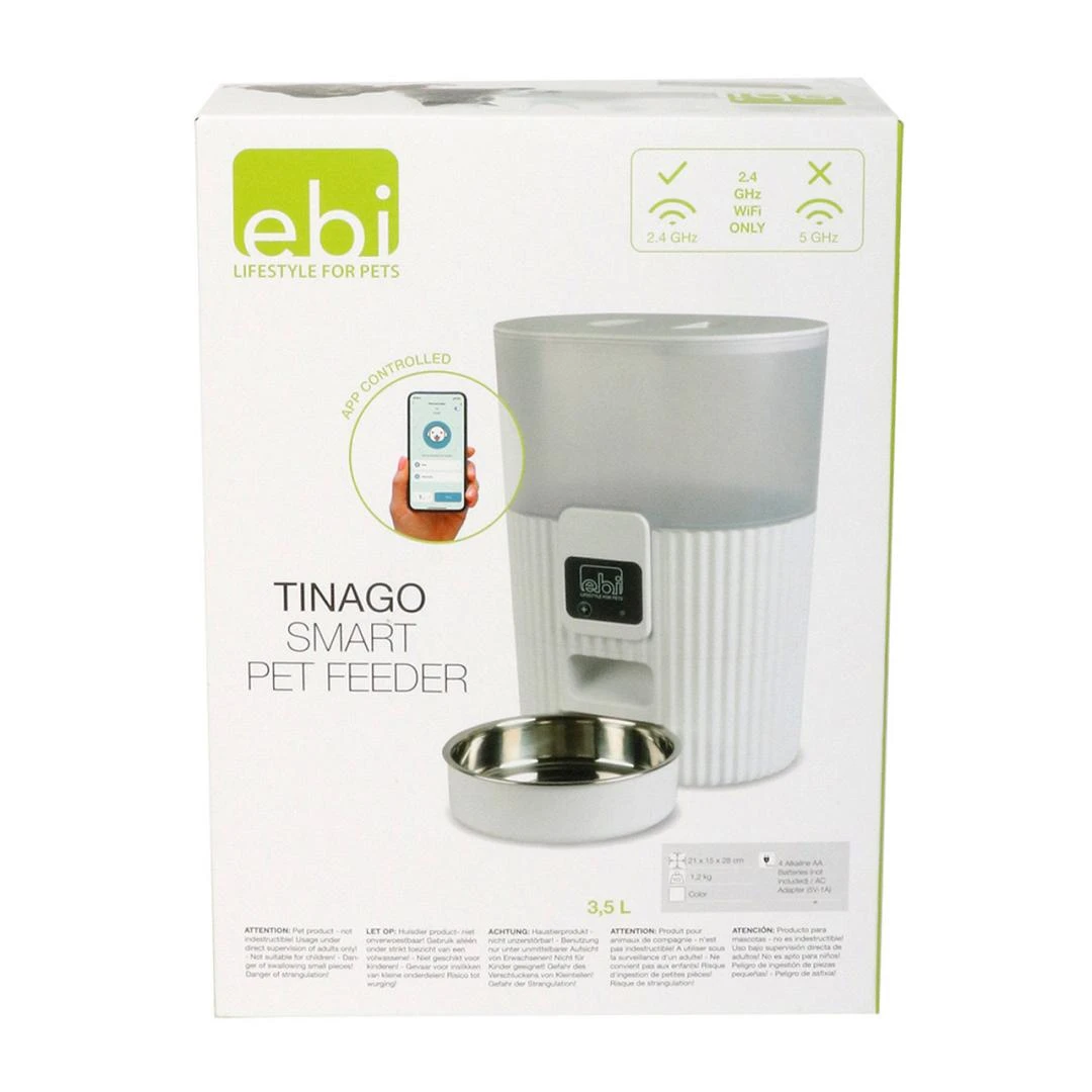 De programmeerbare feeder Tinago is een voersysteem, bedienbaar via een app van EBI, voor honden en katten. Ideaal als je onverwacht een paar uur over moet werken en je huisdier gewend is om op een vast moment eten te krijgen.