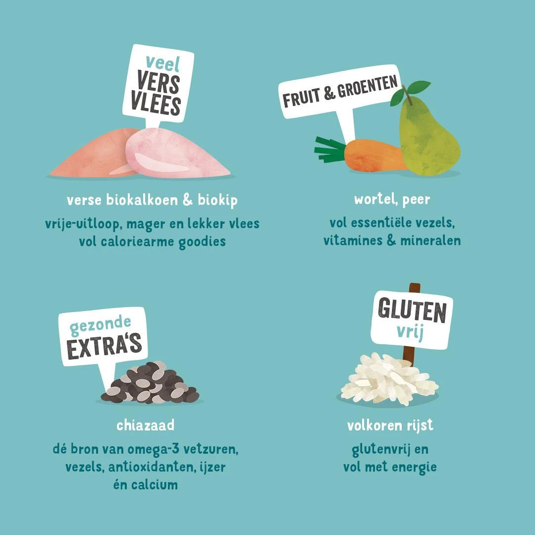 Samenstelling: Biologische verse kip* 25%, biologisch rijsteiwit*, biologische volkorenrijst*, biologische volkorengierst*, biologische volkoren haver*, biologische verse kalkoen* 5%, mineralen, biologische varkenssaus*, biologisch kippenvet*, biologische tomaten* 0,04%, biologische wortels* 0,04%, biologische peren* 0,04%, biologische appels* 0,04%, biologische chiazaden* 0,04%, biologische kokosnoot* 0,04%, biologische brandnetels*, biologische braambesblaadjes*, biologische venkel*, biologische karwij*, biologische kamille*, biologische melisse*.