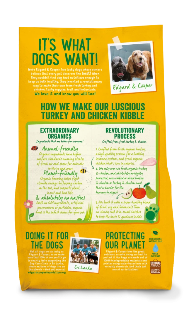 In Edgard & Cooper hondenvoer Adult biokalkoen en biokip wordt enkel verse biologische kalkoen en verse biologische kip gebruikt en absoluut geen bewerkte, overgare of gedroogde kalkoen en kip of meel van kalkoen of kip dat moeilijker is voor de buikjes om te verteren. Daarnaast wordt er een supergezonde mix van fruit, groenten en kruiden toegevoegd.