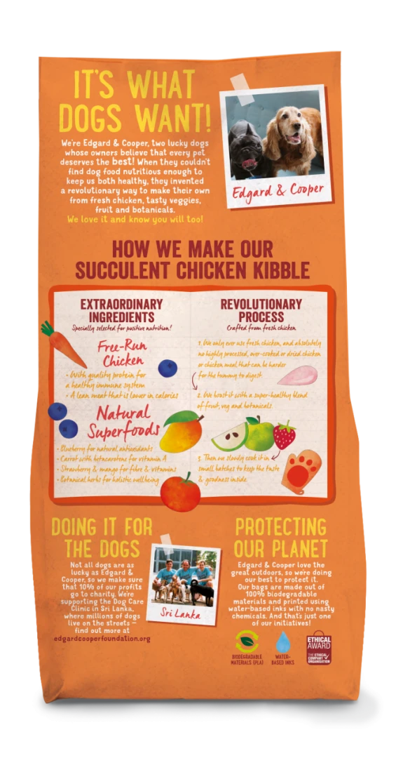 In Edgard & Cooper hondenvoer Adult scharrelkip wordt enkel verse scharrelkip gebruikt en absoluut geen bewerkte, overgare of gedroogde kip of kippenmeel dat moeilijker is voor de buikjes om te verteren. Daarnaast wordt er een supergezonde mix van fruit, groenten en kruiden toegevoegd.