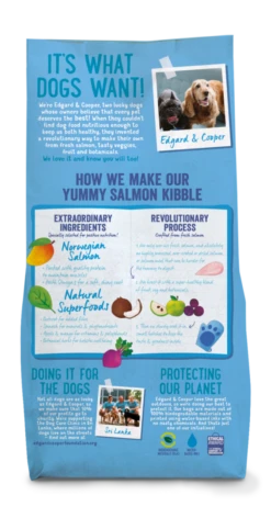 In Edgard & Cooper hondenvoer Adult Noorse zalm wordt enkel verse Noorse zalm gebruikt en absoluut geen bewerkte, overgare of gedroogde zalm of zalmmeel dat moeilijker is voor de buikjes om te verteren. Daarnaast wordt er een supergezonde mix van fruit, groenten en kruiden toegevoegd.