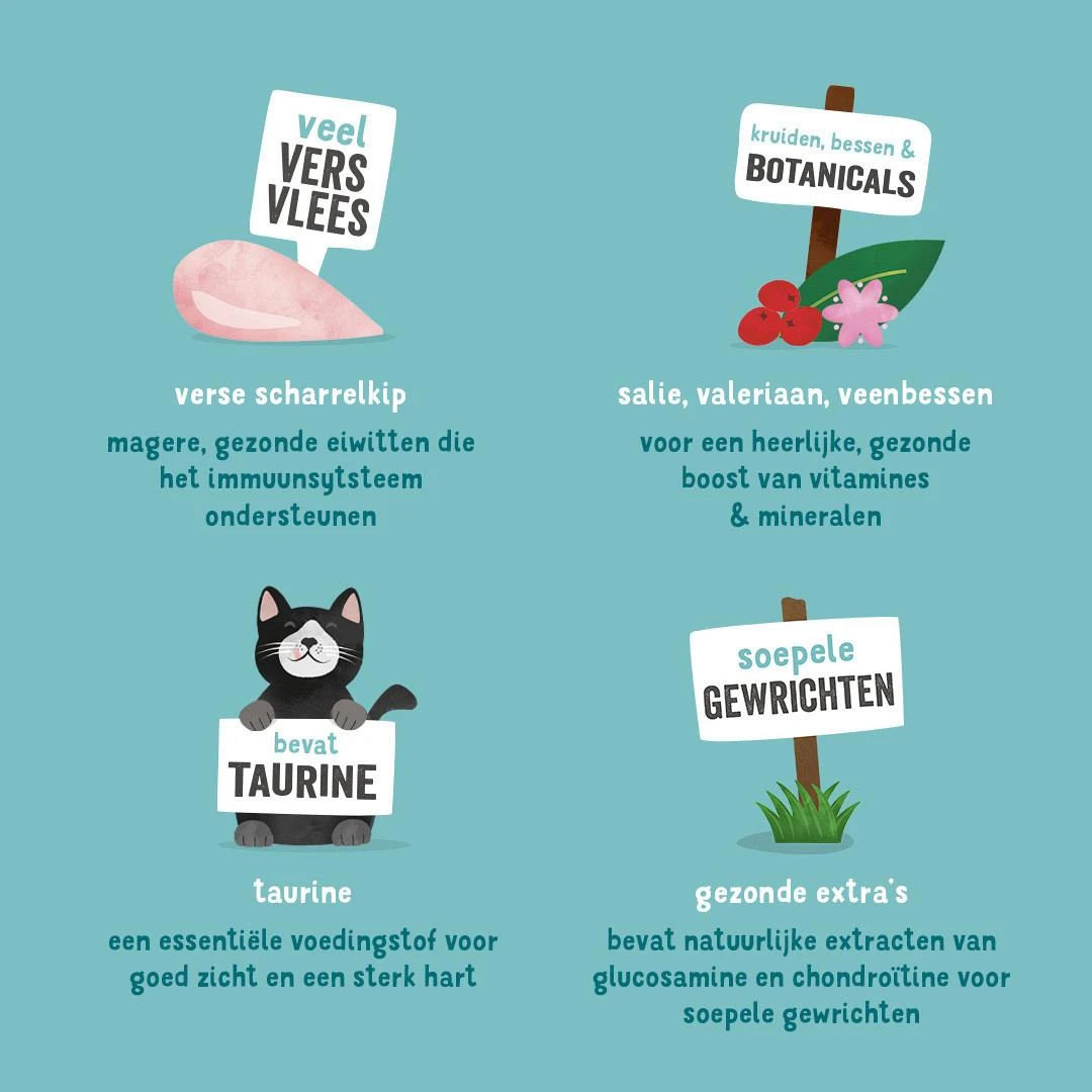 Dit zalige receptje bevat veel verantwoord gekweekte scharrelkip en een zorgvuldig samengestelde mix van salie, valeriaan en veenbessen. Deze extra’s zijn goed voor een overheerlijke vitamine- en mineralenboost. Er wordt geen vleesmeel in deze brokjes verwerkt en ook geen bewerkte of gedroogde ingrediënten.