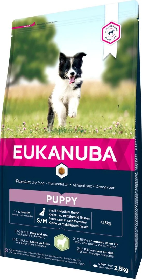 Eukanuba Puppy Small/Medium lamb & rice is een premiumvoer waar alles in zit wat jouw puppy nodig heeft. Eukanuba droogvoer in brokvorm is rijk aan verse lam en rijst, en perfect voor opgroeiende pups van kleine en middelgrote rassen met een leeftijd van 1 tot 12 maanden.
