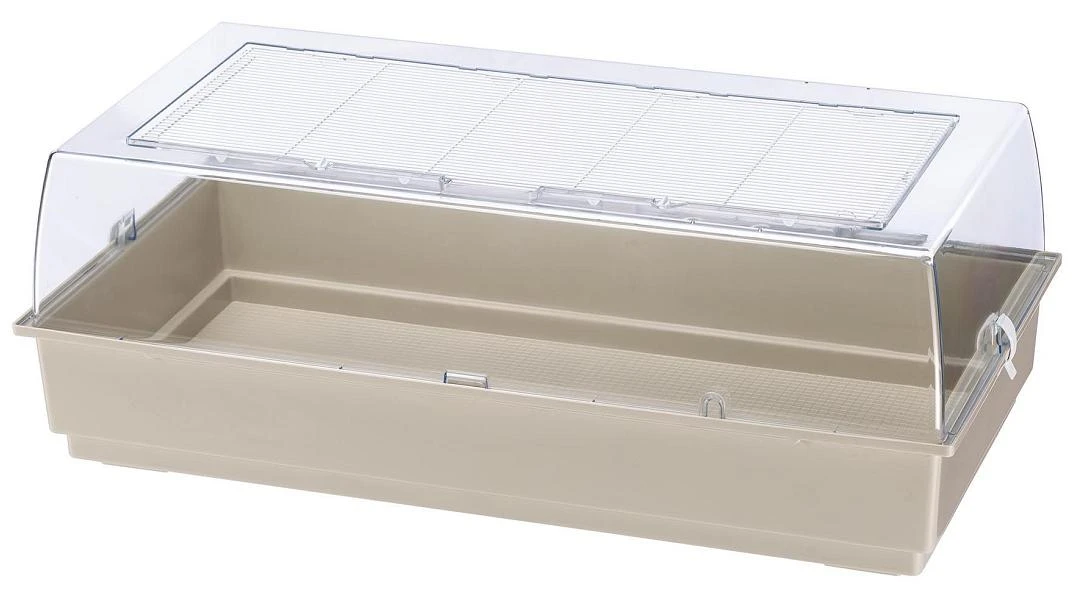 Het is erg groot en heeft een groot, doorzichtig plastic dak met bovenop een rooster dat open kan. Wat betreft schoonmaken, niets is eenvoudiger! De basis is volledig afneembaar van het dak dankzij de handige clips aan de zijkanten.