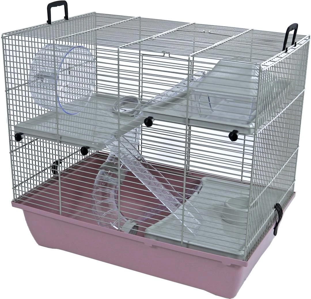 Een rechthoekige hamsterkooi met 3 plateaus, grijs traliewerk en een pastel roze onderbak.
