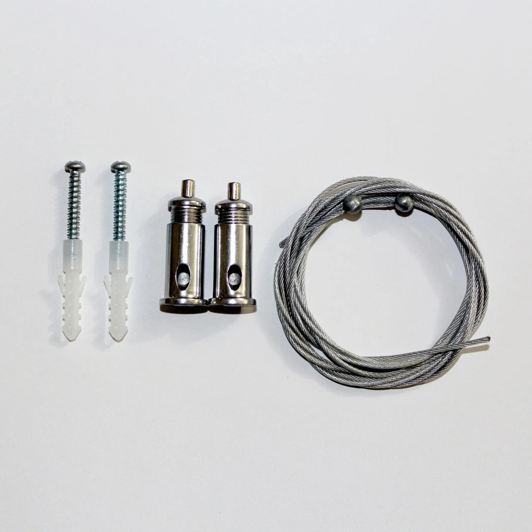 Inhoud: 2 pluggen en 2 schroeven met 2 speciale bevestigingen (voor plafond), 2 x 150 cm RVS kabel.
