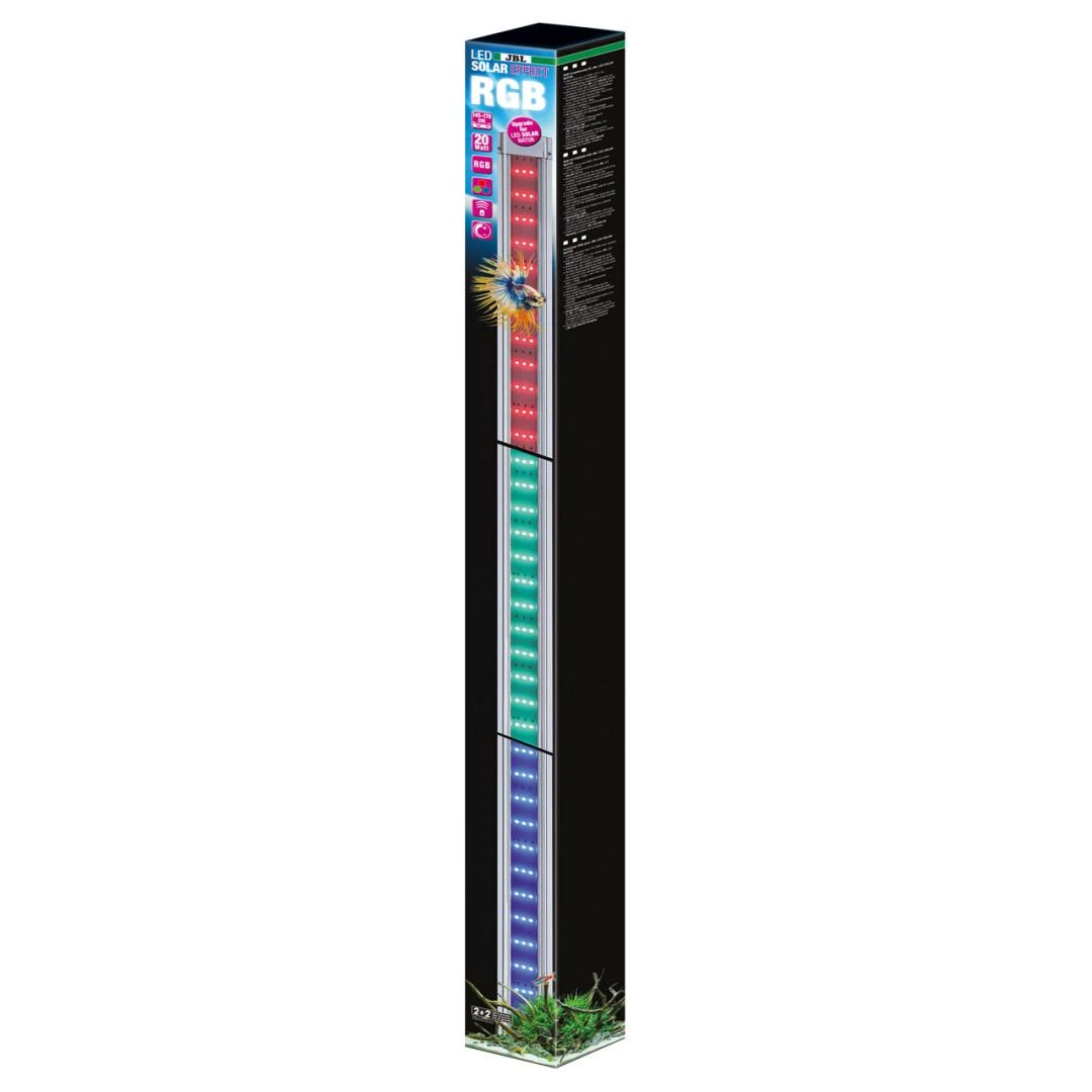 De JBL Solar Effect is speciale verlichting met RGB ledlampjes voor het creëren van kleureffecten, ideaal als vervanging voor een tweede, gekleurde tl-buis (T5 of T8). Simpelweg aansluiten op de kabelswitch van de JBL Solar Natur en via diens afstandsbediening aansturen. Maakt dramatisch gekleurde simulaties van zonsop- en zonsondergang mogelijk evenals weersomstandigheden zoals onweer of moesson.