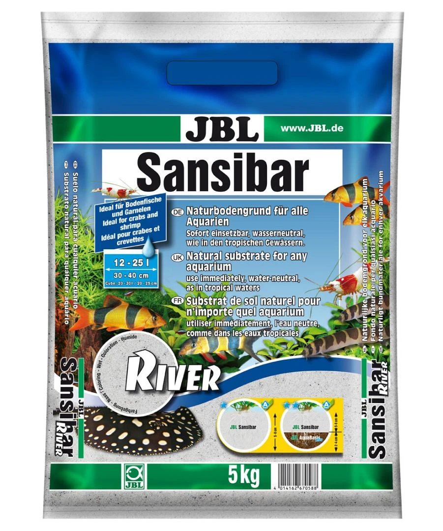 JBL Sansibar river is een fijne, lichte bodemgrond met zwarte steentjes en een korrelgrootte van 0,8 mm voor zoet- en zoutwateraquaria en terraria.