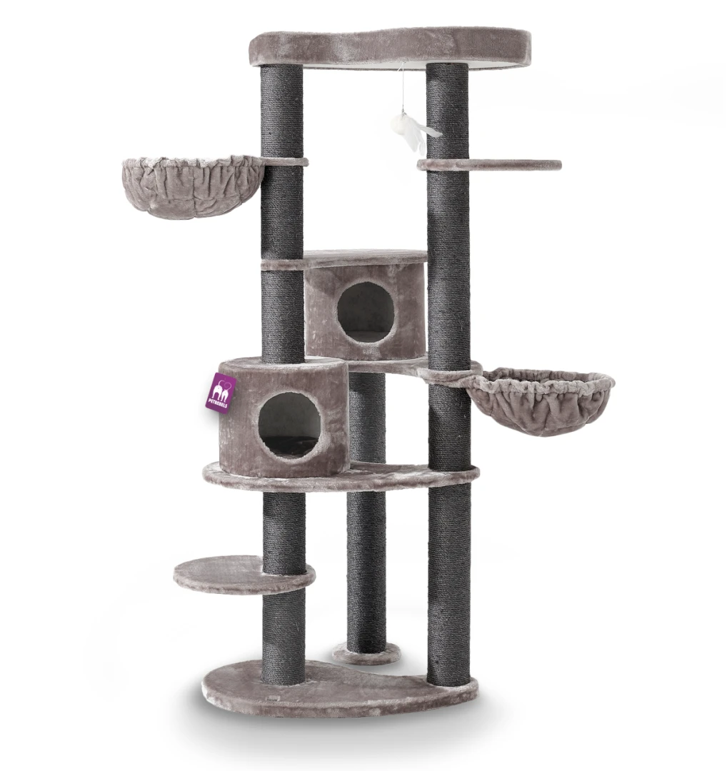 Petrebels Grace 190 is een heerlijk hoge krabpaal en een ode aan Yin-Yang. Yin vind je terug in de zachtheid van de pluche en slaapplekjes. En Yang in de robuuste krabpalen en bodemplaat. Leuk detail: de bekende Yin-Yang vorm zie je terug in de bodemplaat en de XXL-loungemand bovenin. En die vorm is nog handig ook, want daardoor past deze krabpaal ook makkelijk in een hoek.