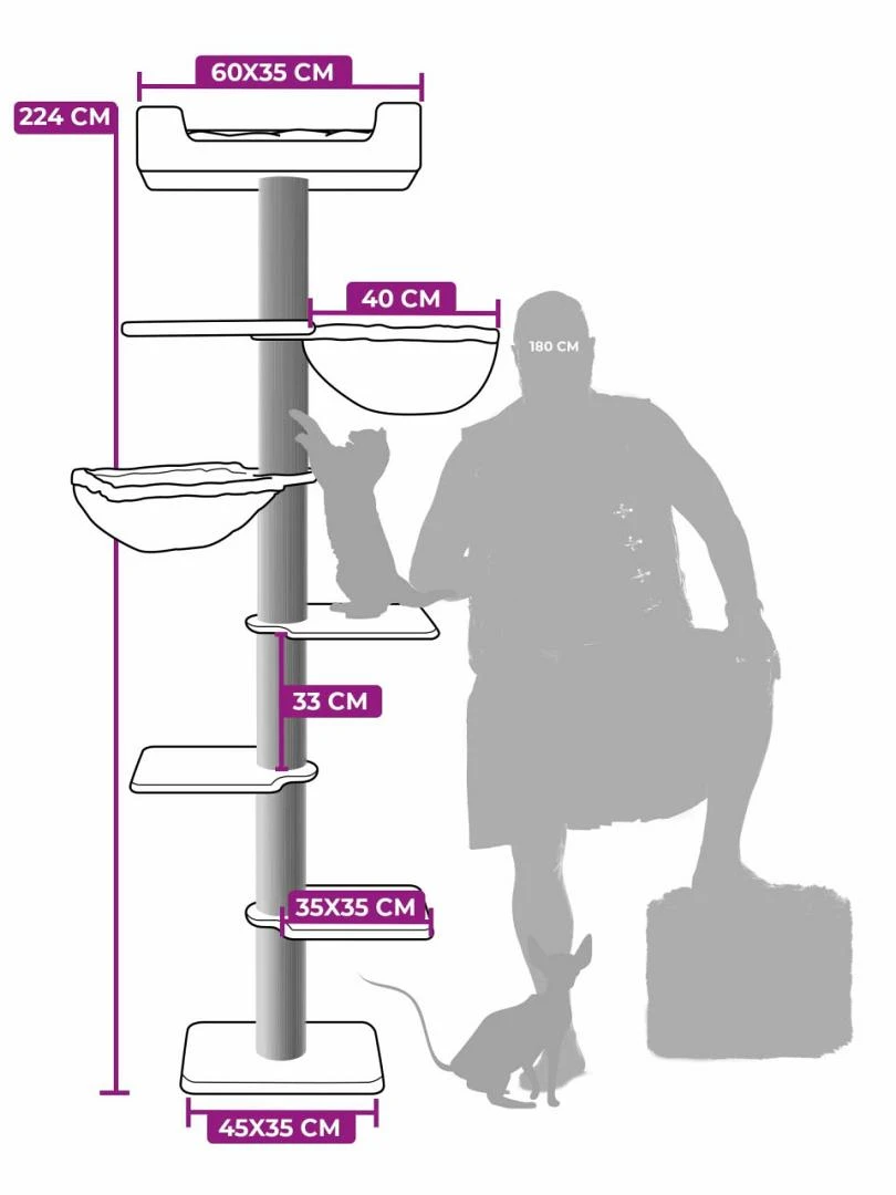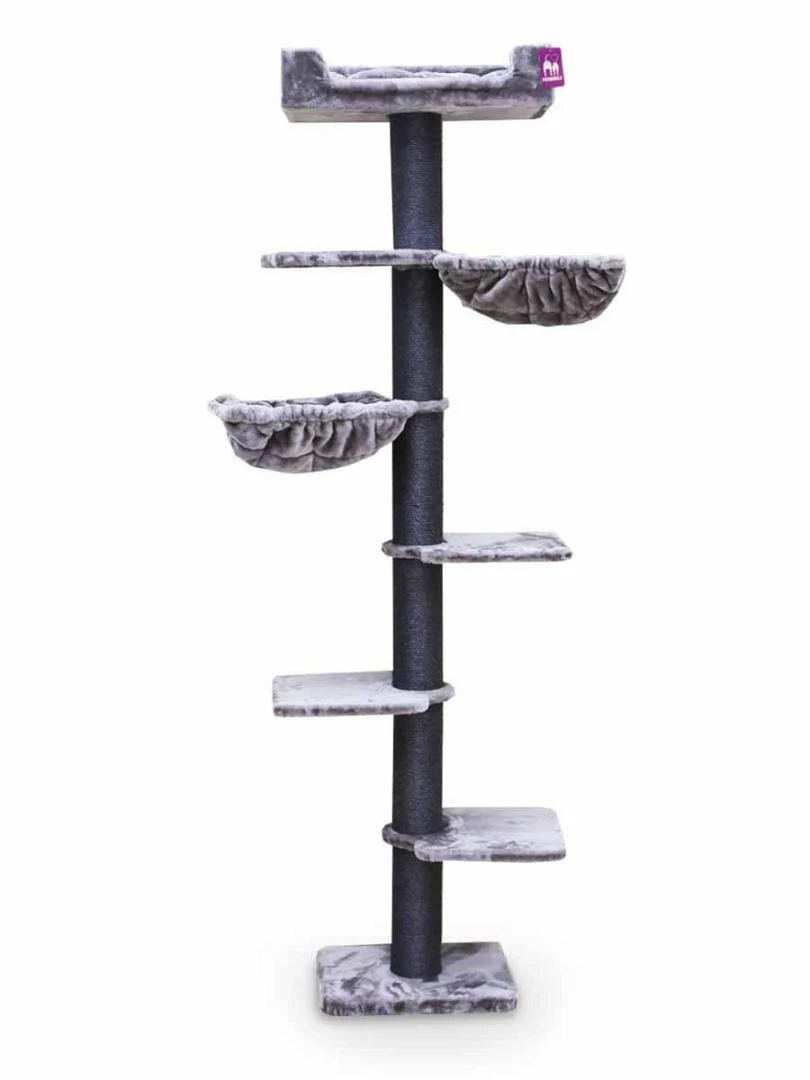 • Zeven slaap- en klimplekken: vier royale plateaus, twee fijne hangmatten en een super-de-luxe loungemand helemaal bovenin