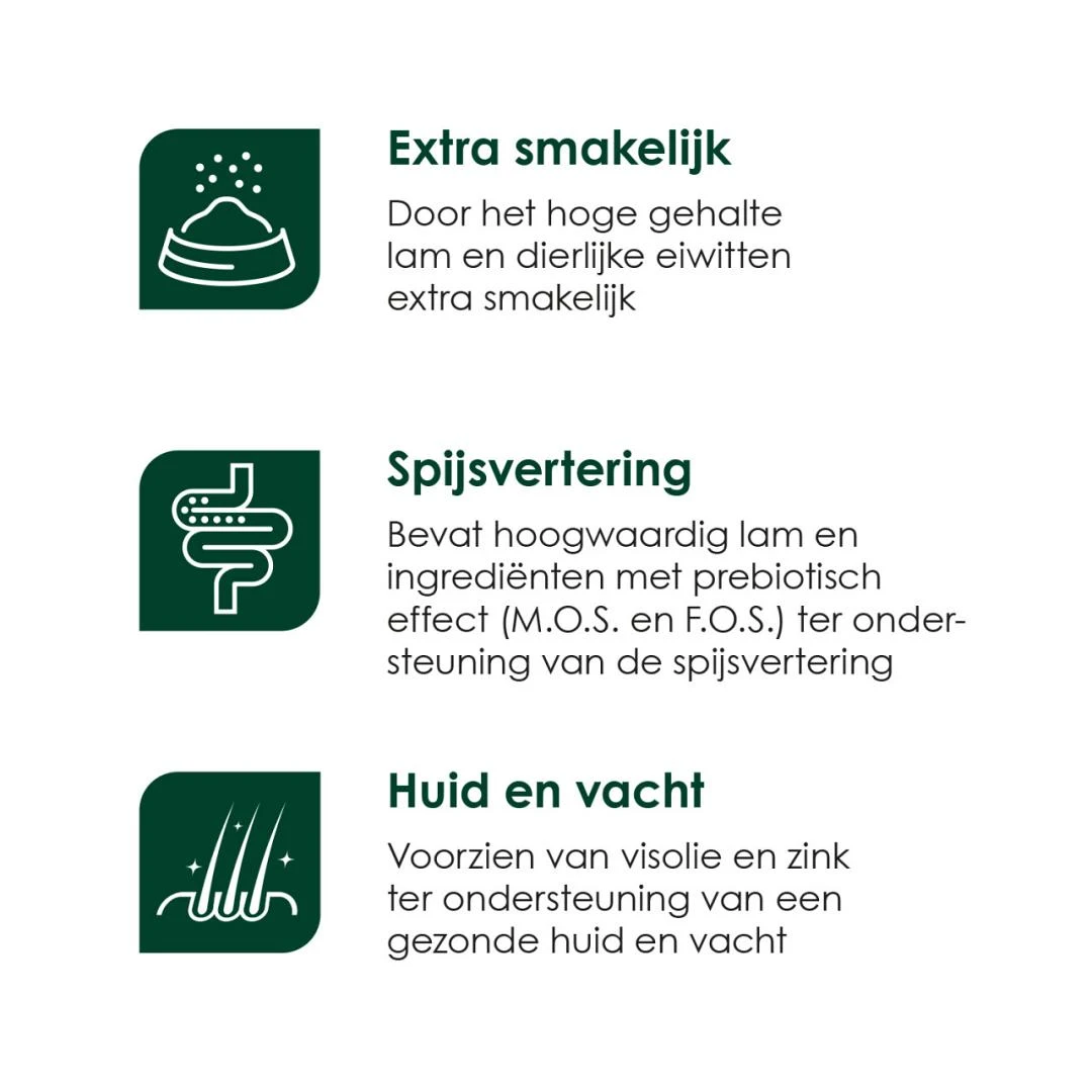 | Spijsvertering Bevat hoogwaardig lam en ingrediënten met prebiotisch effect (M.O.S. en F.O.S.) ter ondersteuning van de spijsvertering. | |