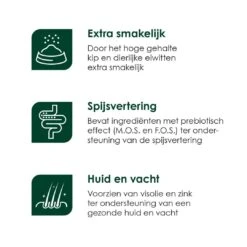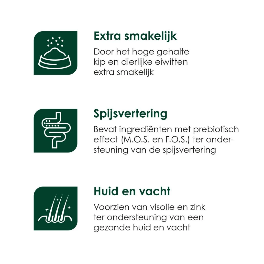 | Extra smakelijk Door het hoge gehalte kip en dierlijke eiwitten extra smakelijk. | |