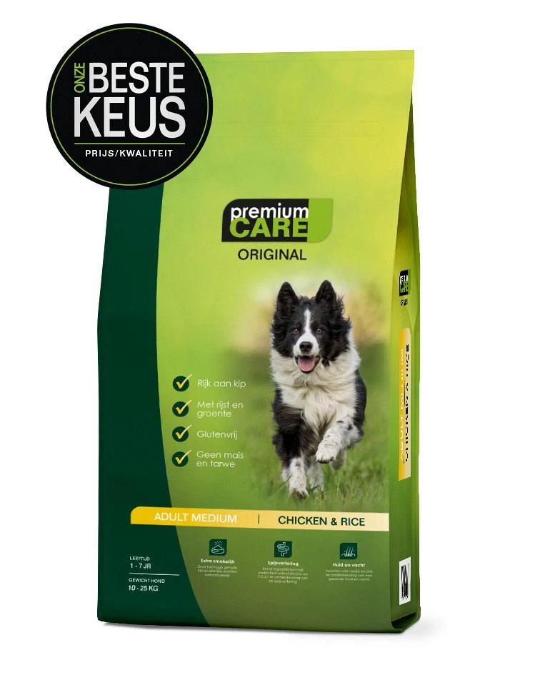 Premium Care Original – Adult Medium Chicken & Rice is een glutenvrije, complete droge hondenvoeding, speciaal ontwikkeld voor volwassen honden. Deze speciale formule beantwoordt perfect aan de voedingsbehoeften van honden van middelgrote rassen en draagt bij tot een optimale levenskwaliteit.
