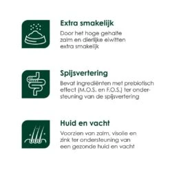 Gedroogde zalm (25%), rijst (25%), erwten (10%), dierlijk vet, gedroogde aardappel (4%), gehydrolyseerd dierlijk eiwit, bietenpulp, mineralen, geraffineerde cellulose, gedroogde biergist, visolie (0,1%), M.O.S., F.O.S., ß-glucanen, plantenextracten (Rosmarinus sp., Vitis sp., Curcuma sp., Citrus sp., Eugenia sp.).
