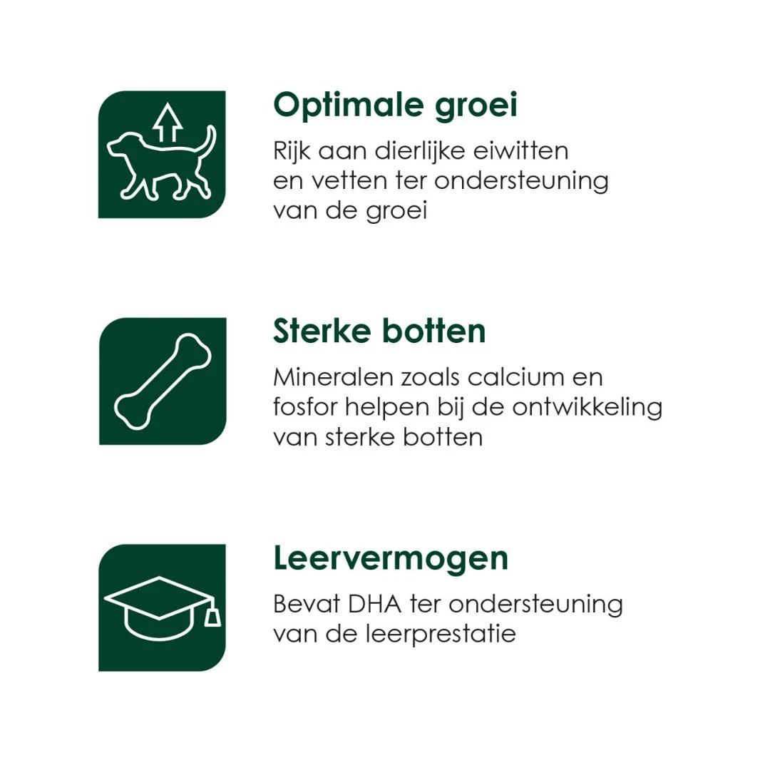 | Optimale groei Rijk aan dierlijke eiwitten en vetten ter ondersteuning van de groei. | |