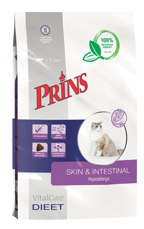 Speciaal voor volwassen katten met een voedselovergevoeligheid (huid- en vachtproblemen) en/of ter ondersteuning van maag-darmproblemen heeft Prins Petfoods een speciale dieetvoeding ontwikkeld, namelijk:Â VitalCare dieet Skin & Intestinal Hypoallergic.