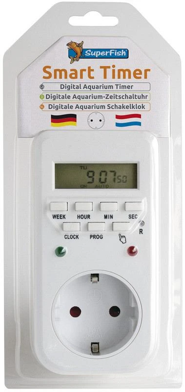 De SuperFish Smart Timer NL is een tijdklok met LCD scherm waarbij je instellingen kan inplannen voor zaken als het aan en uitzetten van verlichting, voederautomaten en regen of nevel systemen.