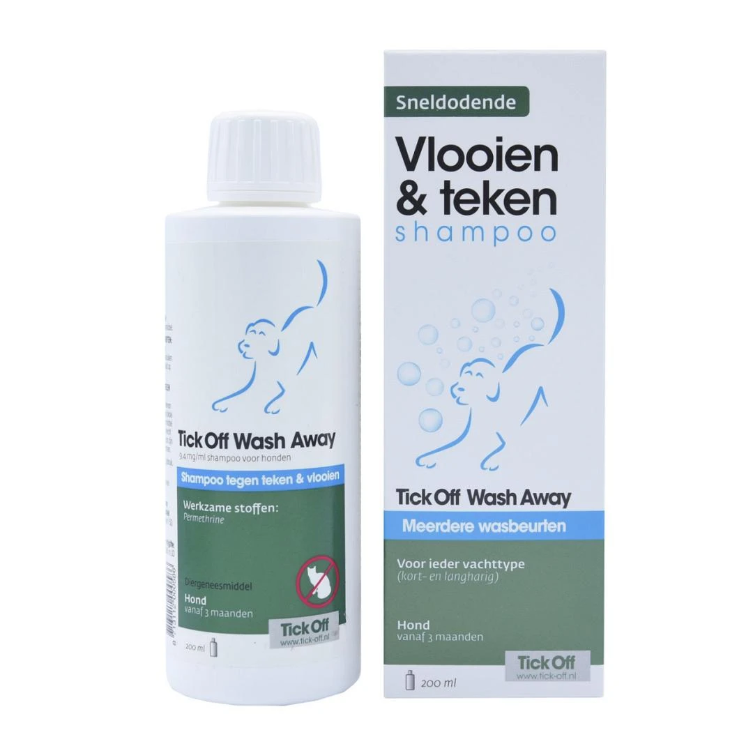 Tick Off Wash Away is een hondenshampoo tegen vlooien en teken. Het bevat de werkzame stof Permethrin. De shampoo doodt bij gebruikt direct alle aanwezige teken en vlooien en is geschikt voor alle honden vanaf 3 maanden oud met een acuut vlooien- of tekenprobleem.
